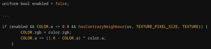 So in the shader, we added a new parameter called "enabled" at the top, and then updated the end of the fragment block to check if enabled is true, like so: