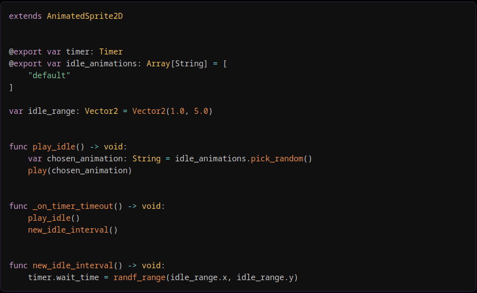 To make these feel more alive, we give each character a list of their available idle animations, and play them at random, with a random wait time afterwards.