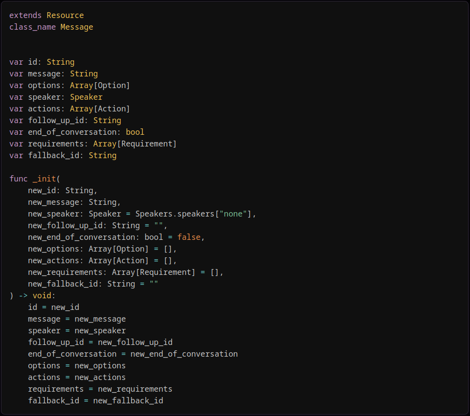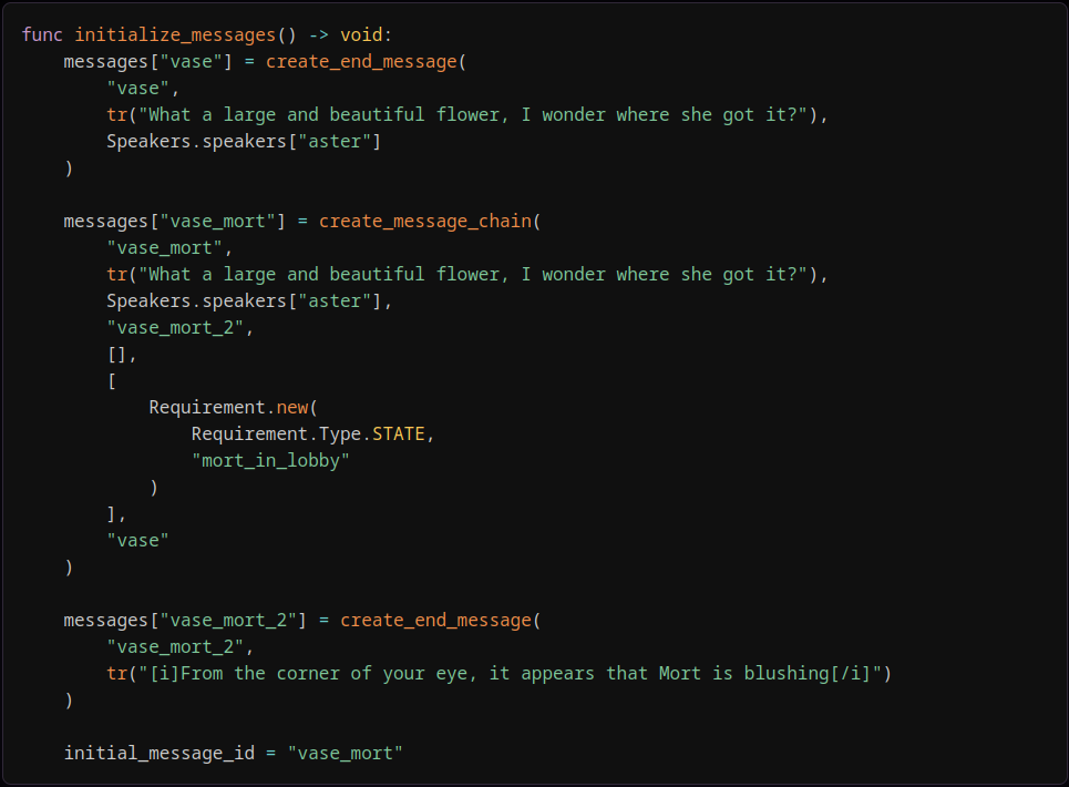 We also wanted to update our "message" system to be able to use requirements in the same way that our "option" system can. But this was unique for messages, as rather than just not displaying, like what happens with options, we needed to track which message to fall back to, if a message shouldn't be played.