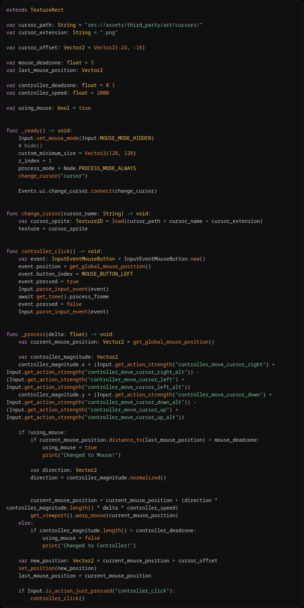 We also setup the cursor script to try to track if the user is using a mouse, or a controller, and to update the mouse position if a controller is being used.